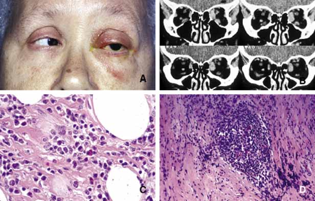 Fig. 10 Orbital pseudotumor. A patient with subacute orbital pseudotumor showing mild proptosis with hyperemia and edema of the eyelids and limited extraocular motility of the left eye (A, B). The left medial rectus muscle is severely involved with the disease that is also present to a lesser degree within the left inferior rectus muscle. Frames C and D reveal a mixture of lymphocytes, plasma cells, and eosinophils wthin fibroadipose tissues of the orbit.