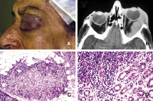 Cellulitis, acute IOI, Sjogren, sino-orbital aspergillosisResolving cellulitis, subacute IOIChronic IOI, underlying neoplasmIOI, lymphocytic or atypical lymphocytic hyperplasia, low grade B-cell lymphoma, lymphangioma, non-specific inflammation, SjogrenForeign body, sarcoidosis, tuberculosis, fungal infections, IOI, ruptured dermoid, fat necrosis (lipogranuloma)giant cell arteritis, Wegener, polyarteritis, mucormycosis