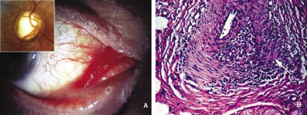 Orbital cellulitis may also be caused by different types of foreign bodies including organic and nonorganic matter and nonautogenous surgical implants.28 Inorganic foreign materials, such as metal and glass, are usually well-tolerated and do not cause infection unless they significantly distort the orbital anatomy with exposure to periorbital sinuses and nasal cavity. Organic foreign bodies such as wood, vegetable fibers, etc., however, trigger significant foreign body reaction and sometimes suppurative inflammation.These should be documented by CT and/or MRI and surgically removed29 (Fig. 3). Today many nonautogenous materials are used in ocular and orbital reconstruction, including porous implants, mesh materials, polymeric silicone plates, sponges for scleral buckling procedures and reservoirs of drainage valves for glaucoma. Implants and repair blocks made of porous materials may lead to acute infection when they erode through sinus or conjunctival epithelium. Whenever there is a foreign body, noncaseating granulomatous reaction with multinucleated giant cells is identified, adjacent to the foreign material; secondary acute inflammation may be superimposed. In penetrating injuries the nature of the foreign body is an important factor.