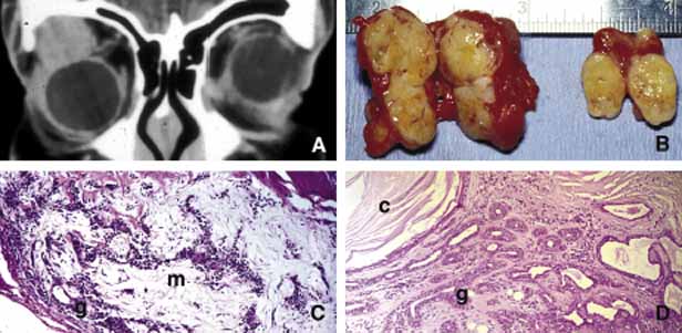Teratoma is a germ-cell tumor that contains tissues derived from endoderm, ectoderm, and mesoderm22 (Fig. 1). Therefore, these lesions may contain skin, bowel, lung, brain, thyroid, cartilage, and bone tissues. Most teratomas develop unilaterally and in girls. A majority of these congenital tumors are benign. Occasional reports have documented malignant transformation within orbitocranial teratomas.23 However, these benign tumors continue to grow after birth because of the collection of secretions from different tissues into the partially cystic spaces of the tumor. Some teratomas create massive proptosis and most can only be treated by exenteration. However, some of these lesions have recently been reported to be removed surgically with preservation of the globe and other vital orbital structures.
