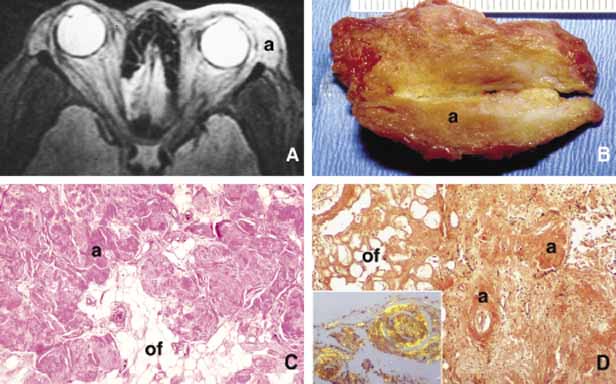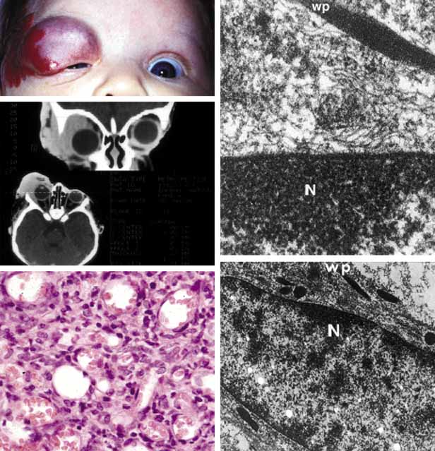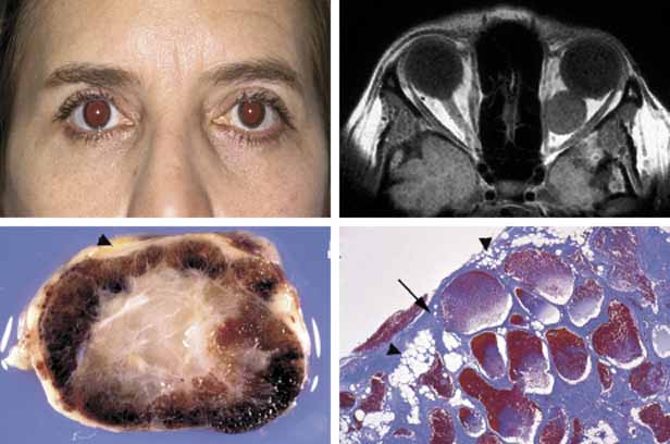 Hamartoma is a tumor-like proliferation of tissues that normally exist at a given body location. The best examples of orbital hamartomas are the vascular hamartomatous lesions that are composed of vascular elements including capillary endothelial cells, distended or collapsed cavernous blood and lymph vessels, tortuous arterial and venous channels with or without anastomoses, etc. Other examples of hamartomatous orbital tumors include neurofibroma and lipomatous hamartoma.15