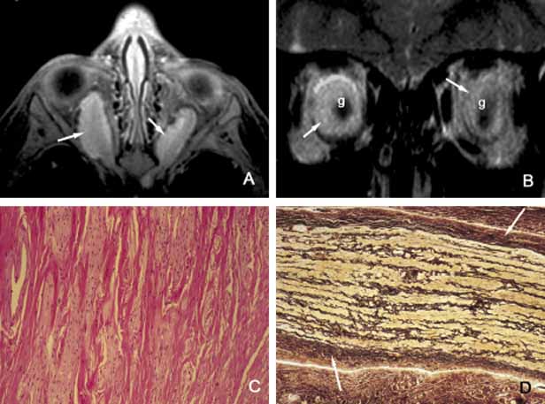 The pathogenesis of Gd is not completely understood; therefore, it is labeled as an “autoimmune” process.82,98 It has been suggested that individuals with HLA-B8 major histocompatility antigen Haplotype are genetically susceptible to Gd.99 The hypothesis is that circulating T-cells directed against an antigen in thyroid follicular cells recognize a similar antigen in extraocular muscles and orbital soft tissues.100 Experimental studies suggest that thyrotropin receptor (TSH-R) is one of the possible entities to stimulate the autoantibodies that lead to the inflammatory changes within orbital soft tissues. In Gd there is a predominance of T-cells with Th1 profile, although Th2 profile of cytokine production has also been reported.100 The cytokines stimulate fibroblasts to produce glycosaminoglycans that in turn lead to deposition of this substance within the muscle tissue leading to anatomic and functional deficiencies (Fig. 9). Although cell mediated immune reaction predominate in early Gd, humoral immunity plays a greater role in later phases.101