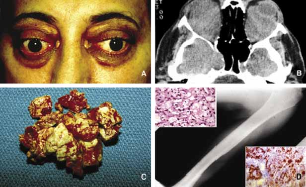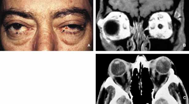 Many forms of inflammatory processes may trigger orbital inflammation that simulates neoplasms by producing proptosis and associated orbital findings.82 These include Graves disease,83–85 idiopathic orbital inflammation (orbital pseudotumor),86,87 Tolosa-Hunt syndrome,88,89 sarcoidosis,90,91 Sjögren syndrome,92,93 and Wegener granulomatosis.94–96