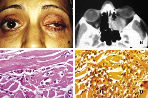 In most instances, fungi infect the orbit as an extension of paranasal sinus disease or after penetrating injury associated with the introduction of organic matter. Most of the fungal infections, particularly mucormycosis often develop in immunocompromised patients.63