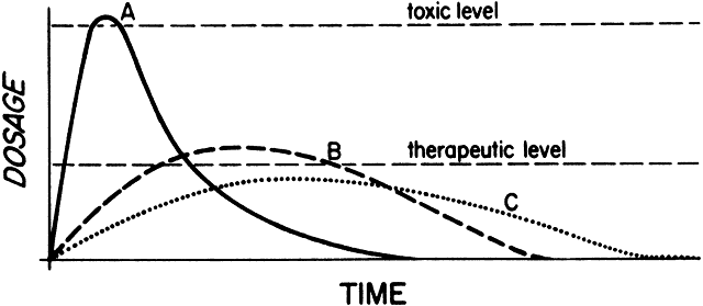 efficacy. The preceding definition of bioavailability is somewhat arbitrary in the sense that a universally acceptable definition does not exist.1,2 The US Food and Drug Administration definition is as follows: Bioavailability means the rate and extent to which the active drug ingredient or therapeutic moiety is absorbed from a drug product and becomes available at the site of drug action. Different definitions are used by the European Economic Council, textbooks, and workshops addressing the subject.3 There is a strong tendency to define bioavailability as the percentage of drug absorbed into the blood. This is because most data have been collected from studies of oral medications, in which absorption was monitored by assaying blood content. To those who prescribe topical medications, however, such as the ophthalmologist and dermatologist, the blood levels are often important only for monitoring side-effects and toxicities, not therapeutic efficacy. Bioavailability studies are concerned with not only the amount of drug absorbed but also with how the manufacturing process alters both the rate of drug absorption and the consistency of drug absorption. Three brands of a drug may be absorbed completely (i.e., have 100% bioavailability) and yet the first may be therapeutically effective; the second, therapeutically ineffective; and the third, toxic. This would occur (Fig. 1) if the toxic brand was absorbed too rapidly and if the ineffective brand was absorbed too slowly. In the former instance, the therapeutic level would be exceeded; in the latter instance, the therapeutic level would not be attained. Wide variations in the disintegration rates of three oral tablets could produce this problem. Batch-to-batch consistency of absorption is important, especially in treating chronic disease. The ophthalmologist following the intraocular pressures of a glaucoma patient would prefer using a brand that is always 80% absorbed rather than a brand that has an absorption rate that fluctuates between 60% and 100%. In the latter instance, the physician would be unable to distinguish between fluctuations in the disease process and fluctuations in the effectiveness of the medication.