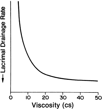 Half the molecules of sulfamethazine are undissociated at the pH of the tears, which is a far better fraction than that of penicillin. It is understandable why so many topical eye medications are “alkaloids”—they tend to be nondissociated at the pH of tears. The pH of the eye-drop preparation and the degree to which the preparation is buffered have an obvious influence on tear pH and drug penetration. Mitra and Mikkelson26 found that as the concentration of citrate buffer increased from 0 to 0.11 mol, the miosis from 1.0% pilocarpine nitrate pH 4.5 eye drops decreased. Presumably, the higher the buffer concentration, the longer the time for the precorneal tear film to return to physiologic pH and the higher the ratio of dissociated to nondissociated molecules of pilocarpine. Hammarlund and coworkers27,28 manipulated this variable in a clever way. They prebuffered the tear film of volunteers using a pH 9.2 solution and found that they could then give one tenth the amount of cyclopentolate, phenylephrine, or homatropine that is usually administered (e.g., 0.1% cyclopentolate instead of 1% cyclopentolate) and still obtain the same pharmacologic response. Smith and coworkers29 and Saari and coworkers30 circumvented the effect of eye-drop pH by applying pilocarpine base in castor oil. The eyes of volunteers given the oil preparation had more marked and longer-lasting miosis-hypotension than did eyes given an equimolar water solution of pilocarpine nitrate. Riegelman and Vaughan31 reviewed the effect of pH on ocular discomfort. They state that the buffering capacity of the tears is adequate to bring unbuffered solutions of pH 3.5 to 10.5 to within “tolerable” (i.e., not painful) limits almost immediately. The greater the degree to which the solution is buffered, the more narrow is the range of comfort. It is not clear how far the pH of a solution must deviate from that of tears to induce a reflex increase in lacrimation, however. That is, it is unknown whether the solution must be subjectively painful to induce increased lacrimation. It is possible that even though the pH does not cause pain, it may initiate an increase in reflex tearing that removes additional drug. Not only may a buffer alter the proportion of nondissociated drug and the amount of reflex tearing, but there may be drug-buffer interactions unrelated to pH. Apel and Horsch32 found that at the same pH, pilocarpine 2% solutions were more stable in acetate buffer than in borate buffer. VISCOSITY. Excipients such as hydroxypropyl methylcellulose and polyvinyl alcohol are frequently added to increase the viscosity of ophthalmic solutions. Presumably, drug-corneal contact time is prolonged by retarding lacrimal drainage. Although simple in concept, this has been a controversial area. Some reports state that viscosity increases drug contact time and bioavailability.33–35 Other reports state that increases in viscosity are of little or no value.36,37 To add to the confusion, some experiments indicate hydroxypropyl methylcellulose is therapeutically superior to polyvinyl alcohol, whereas other experiments give the opposite result.38–40 Swanson and coworkers41 reported an intermediate position: hydroxypropyl methylcellulose was superior to polyvinyl alcohol for the 15- to 30-minute period after drop instillation but polyvinyl alcohol was superior to hydroxypropyl methylcellulose for the 2- to 8-hour period after drop instillation. The explanations for these discrepancies have been multiple and not entirely satisfactory. Species differences in tear, blink, and corneal physiology have been invoked by those who state that human and rabbit studies are not comparable. Wang and Hammarlund28 added to both the validity and the complexity of this argument by reporting that 0.5% hydroxypropyl methylcellulose was of little value in whites but of significant value in Asians. Another explanation has been that both polyvinyl alcohol and hydroxypropyl methylcellulose exist as polymers of varying size and they tend to coagulate further on heating. Perhaps the solutions of 1.4% polyvinyl alcohol and 0.9% hydroxypropyl methylcellulose used in different laboratories were nonequivalent. A third explanation has been that in those instances in which viscolizers are of value, the effect may have been due not to prolonged contact time but to better initial mixing of the drug with the tears. Patton and Robinson42 have provided some important insights that may ultimately resolve the preceding controversies. They were careful to work in units of viscosity (cs) rather than percent concentration of viscolizer. They found that when polyvinyl alcohol and hydroxypropyl methylcellulose were compared on a viscosity basis, there was little difference in their influence on drug bioavailability. Furthermore, the effect of increasing the concentration of viscolizer was nonlinear relative to viscosity. For example, increases in polyvinyl alcohol up to 3% resulted in only small increases in viscosity and corneal contact time. Beyond 3%, however, there were rapid increases in the viscosity and contact time of polyvinyl alcohol, presumably because of increased hydrogen bonding between molecules. Further increases beyond 5% and up to 10% were of little additional value. An optimum effect of viscosity was found beginning at 12 cs (Fig. 2). Commercial preparations of 0.5% hydroxypropyl methylcellulose exceeded this minimum, whereas 1.4% polyvinyl alcohol solutions did not. Patton and Robinson42 have also noted that a highly viscous solution may not be especially useful because of the shear created by blinking. This could cause the tear film to thin to the extent that large increases in viscosity may provide only slight increases in contact time.