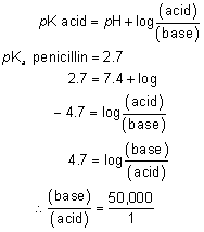 There is only one molecule of undissociated penicillin for every 50,000 dissociated molecules. This is one important reason why penicillin eye drops do not penetrate the intact corneal epithelium well. Conversely, the pKa of sulfamethazine is 7.4: