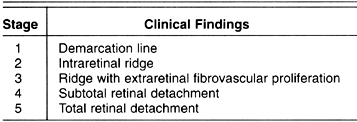 new window Table 10-2: Stages of retinopathy of prematurity